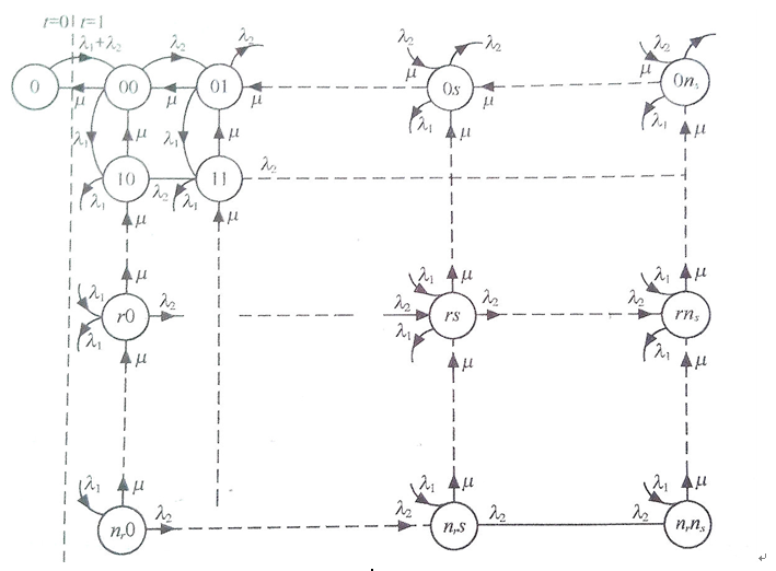 系統(tǒng)狀態(tài)主要有兩個因素:線路的繁忙,A.B兩隊等待處理的呼叫數(shù)。令t為線路狀態(tài),t =1表示線路占用,t=0表示線路空閑。r與s分別表示A.B兩隊中等待的呼叫數(shù)。r與s不包括正在傳輸?shù)暮艚校驗楹笳呖赡苁茿隊的,也可能是B隊的。其中,兩隊的到達率分別為 和 ,服務(wù)率為 。