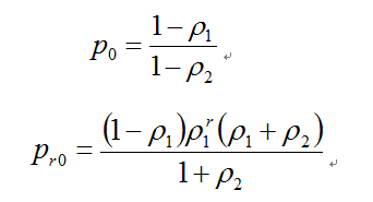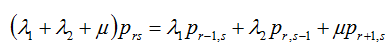 圖1中所體現(xiàn)出來的優(yōu)先制度為:當(dāng)r>0時,(r,s+1)狀態(tài)不能轉(zhuǎn)移到(r,s)狀態(tài),因為一旦有線路空閑,A隊就會占用線路,就轉(zhuǎn)移到(r-1,s+1)狀態(tài)。由圖1可寫出穩(wěn)態(tài)下的系統(tǒng)狀態(tài)方程: