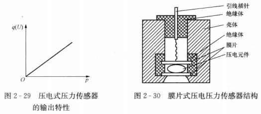 利用測量電路測量出壓電材料表面的電荷量,便可得到被測對象的壓力值。一般的壓電式壓力傳感器的輸出電荷量(或電壓)與被測對象壓力成正比,具有良好的線性度,如圖2-29所示。