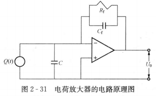 圖2-31所示為電荷放大器的電路原理圖。圖中電阻Rf與電容Cf并聯(lián)是為了給運算放大器的基流提供一條泄漏通道,以防止放大器中的積分器趨于飽和。值得注意的是,圖中電容C包括三部分,即壓電晶體的電容、放大器的輸入電容和引線的電容。其中引線的電容與引線的長度有關(guān),因此消除引線的電容十分重要。消除的方法有兩種:①對連接引線進行屏蔽,通常采用屏蔽導線;②將放大器放在傳感器內(nèi),即做成一體化的壓電式壓力傳感器。這樣引線的電容就成為一個很小的常量,而傳感器以外的部分就只有電源和記錄顯示儀器了,由于它們與低阻抗的輸出端相連,因此對系統(tǒng)性能的影響就可忽略不計。