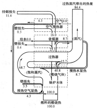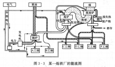 能源利用流向圖是根據(jù)生產(chǎn)過程的用能按比例繪制的圖形,有時又簡稱能流圖。通過能流圖可以形象直觀地表示能量的來龍去脈、能量的分布、利用程度和損失大小。在能流圖中應(yīng)明顯地表示各項輸入能量、輸出能量、有效利用能量、損失能量和回收利用的能量。各項能量均以供給能量的百分?jǐn)?shù)表示,并按一定比例用不同寬度的能流帶來表示百分?jǐn)?shù)的大小。能流圖按表示的范圍,可以分為全國和地區(qū)能流圖、企業(yè)能流圖和設(shè)備能流圖等,按其性質(zhì)則有熱流圖、汽流圖和電流圖等,其中尤以熱流圖應(yīng)用最為普遍。圖3-2所示為某一大型鍋爐的熱流圖.圖3-3所示為某一煉鐵廠的能流圖。