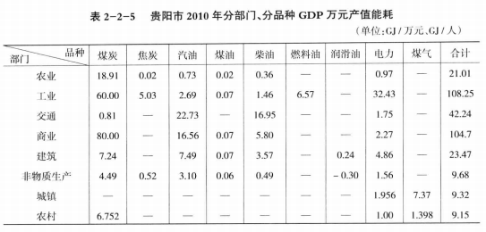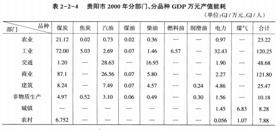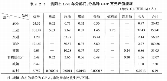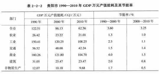 科技的投入與技術(shù)的進(jìn)步,使得單位產(chǎn)值的能源消耗減少,用較少的能源投入,保證了同樣的經(jīng)濟(jì)發(fā)展。從現(xiàn)實(shí)看,節(jié)能在起初階段比較容易,進(jìn)一步取得節(jié)能效果難度加大,需要投入更多的資金。國內(nèi)外經(jīng)驗(yàn)表明,節(jié)能是減少污染物排放的最主要措施,有利于環(huán)境保護(hù)。貴陽市目前產(chǎn)值能耗高,存在著較大的節(jié)能潛力,節(jié)能具有廣闊的前景。產(chǎn)業(yè)結(jié)構(gòu)的變化、設(shè)備的更新改造、科技與技術(shù)的投入等都將給節(jié)能帶來契機(jī)。1990年貴陽市CDP萬元產(chǎn)值能耗為122.51 GJ,其中農(nóng)業(yè)產(chǎn)值能耗為26.42 GJ、工業(yè)為150.41 GJ、交通運(yùn)輸業(yè)為56.52 GJ、商業(yè)為180.26GJ、建筑業(yè)為31.05 GJ、非物質(zhì)生產(chǎn)部門為12.07 GJ。1990-2000年貴陽市能源節(jié)約率將達(dá)到3.60%、2000-2010年達(dá)到3.25%。請見表2-2-2貴陽市1990-2010年GDP萬元產(chǎn)值能耗及其節(jié)能率,表2-2-3貴陽市1990年分部門分品種GDP萬元產(chǎn)值能耗,表2-2-4貴陽市2000年分部門分品種GDP萬元產(chǎn)值的能耗,表2-2-5貴陽市2010年分部門分品種GDP萬元產(chǎn)值能耗。