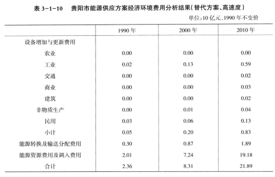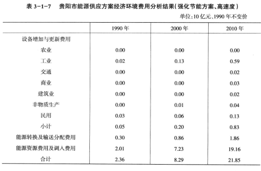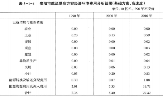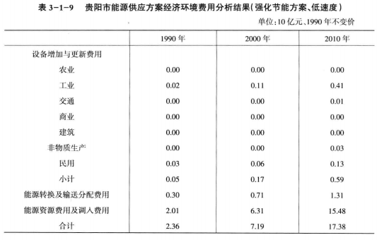 通過模型經(jīng)濟費用評價子模塊的運算,9個不同的可供選擇的能源供應(yīng)方案經(jīng)濟環(huán)境費用分析結(jié)果列于表3-1-4、表3-1-13。