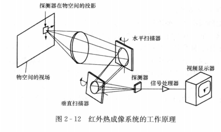 紅外熱成像系統(tǒng)的工作原理如圖2-12所示,光學(xué)系統(tǒng)先將現(xiàn)場的紅外輻射能匯集起來,經(jīng)光譜濾波和光機(jī)掃描,聚集到探測器的紅外元件的陣列上,探測器將強(qiáng)弱不同的輻射信號變成電信號,然后經(jīng)放大和視頻處理,形成視頻信號,再送至顯示器。
