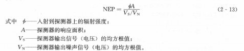 (6)熱靈敏度。對紅外熱成像系統(tǒng)而言,探測器不僅能接受到入射輻射能的信號,還能接受由其他因素,如環(huán)境和本機(jī)等所引起的噪聲信號。噪聲信號的存在限制了探測器對微弱信號的探測能力。通常用噪聲等效功率NEP來表示探測器或紅外熱成像系統(tǒng)的熱靈敏度,即