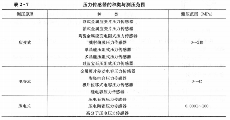 實(shí)際應(yīng)用中壓力測量的范圍極寬,從接近真空到幾千個(gè)大氣壓,而每種壓力傳感器都只能在一定的壓力范圍內(nèi)使用。壓力傳感器的種類與測壓范圍見表2-7。