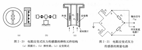 電阻應(yīng)變式壓力傳感器的彈性元件可根據(jù)被測介質(zhì)和測量范圍的不同而采用不同形式,常見的有圓膜片、彈性梁、應(yīng)變筒等,結(jié)構(gòu)見圖2-20,測量電路如圖2-21所示。