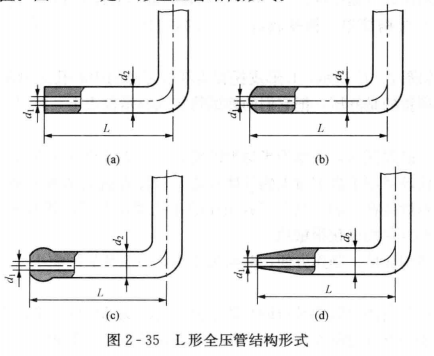 一般對測壓管的要求是:①在慣性不大的情況下,感壓部分的尺寸要盡量小;②對來流方向的敏感性越遲鈍越好;③要有足夠的強度;④感受孔與測壓管輯軸之間要保證最小的距離。全壓管最關(guān)鍵的參數(shù)是對流動偏角不敏感,因為在實際應(yīng)用中,并不能十分準確地使測量孔對準來流方向。而由于它的不敏感性,即使來流方向與全壓孔軸線有一定的偏角,也可以正確地測量全壓值。圖2-35是L形全壓管結(jié)構(gòu)形式。