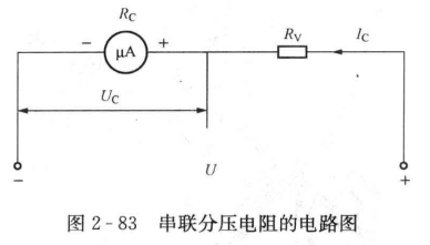 磁電系直流電壓表是由磁電系測(cè)量機(jī)構(gòu)與分壓電阻串聯(lián)組成的,見圖2-83,根據(jù)歐姆定