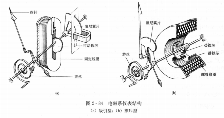 電磁系儀表結(jié)構(gòu)有吸引型、推斥型和吸引一推斥型三種形式(見圖2-84)。吸引型的驅(qū)動(dòng)力矩是利用線圈通電后,對(duì)可動(dòng)鐵芯產(chǎn)生吸引力.使指針偏轉(zhuǎn)。推斥型則靠線圈同時(shí)對(duì)固定、可動(dòng)鐵芯進(jìn)行磁化,由于磁化的極性相同,產(chǎn)生互斥而形成驅(qū)動(dòng)力矩。顯然驅(qū)動(dòng)力矩與通過線圈的電流大小有關(guān),因此根據(jù)儀表指針偏轉(zhuǎn)角的大小即可得到電流值。但由于指針偏轉(zhuǎn)角與被測(cè)電流的平方成正比,因此標(biāo)尺呈平方律特性,前密后疏。另外,電磁系儀表的固定線圈有感抗,鐵片有渦流,這些都隨頻率而改變,使讀數(shù)產(chǎn)生誤差。所以電磁系儀表一般只適用于工頻測(cè)量。