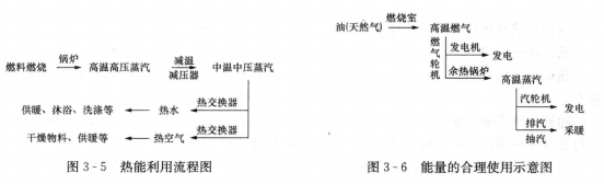 因此,總能系統(tǒng)的指導(dǎo)思想是先做功后用熱,即燃料的能量先通過(guò)汽輪機(jī)或燃?xì)廨啓C(jī)或內(nèi)燃機(jī)做功或發(fā)電,然后把低品位熱量作為熱源加以利用;對(duì)于工藝過(guò)程放出的熱量,先做功后再作為熱源使用。典型例子如圖3-6所示。