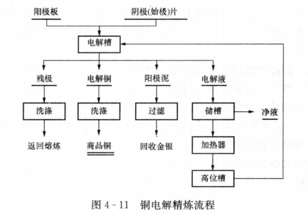 (4)陽極銅電解精煉。銅的電解精煉是在鋼筋混凝土制作的長方形電解槽中進行,槽內(nèi)襯鉛皮或聚氯乙烯塑料以防腐蝕,電解槽放置于鋼筋混凝土的橫梁上,槽子底部與橫梁之間要用瓷磚或橡膠板絕緣,相鄰兩個電解槽的側(cè)壁間有空隙,上面放瓷磚或塑料板絕緣,再放導(dǎo)電銅排連接陰陽極。電解精煉以火法精煉的銅為陽極,硫酸銅和硫酸水溶液為電解質(zhì),電銅為陰極,向電解槽通直流電使陽極溶解,在陰極析出更純的金屬銅的過程,如圖4-11所示。雜質(zhì)進入陽極泥或保留在電解液中,需要定期抽出電解液進行凈化。
