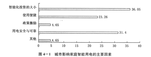 影響家庭智能用電主要因素的統(tǒng)計(jì)調(diào)查結(jié)果如圖4-1所示。居民家庭是否采用智能化用電方式主要出于智能化投資的大小、使用的便捷性以及用電安全與可靠性的考慮。居民對(duì)于家庭智能用電的期望成本較低,幾乎所有的居民認(rèn)為此費(fèi)用應(yīng)占家庭年收入的5%以下或者在5%~10%。超過半數(shù)的居民認(rèn)為有必要對(duì)家電進(jìn)行智能控制和調(diào)整。手機(jī)與電腦的普及應(yīng)用使得接近80%的居民希望采用手機(jī)、電腦對(duì)家電進(jìn)行遠(yuǎn)程控制,67.44%的受訪居民希望對(duì)家庭每月的電費(fèi)進(jìn)行預(yù)算設(shè)置。