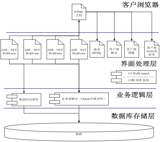 業(yè)務(wù)邏輯層負責接收瀏覽器傳來的請求并將請求傳給數(shù)據(jù)庫存儲層,同時將請求處理結(jié)果發(fā)給瀏覽器。它由Web表單、XML Web服務(wù)和組件服務(wù)組成。其中Web表單是ASP.NET應(yīng)用程序的核心所在,它是向客戶呈現(xiàn)數(shù)據(jù)和信息的基礎(chǔ),也是響應(yīng)和處理客戶與顯示的Web表單交互生成的信息和數(shù)據(jù)的基礎(chǔ)。