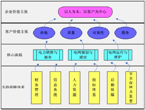 電力企業(yè)核心價值體現(xiàn)在三個層面的有機統(tǒng)一:以人為本的核心價值確立了電力企業(yè)的價值標準,也是企業(yè)的終極使命;以供電可靠性為根本的核心能力為核心價值建立了可衡量的指標體系,是核心價值的體現(xiàn)形式;而業(yè)務(wù)流程是為保障核心能力實現(xiàn)并通向價值鏈終極目標而設(shè)計的動態(tài)過程。