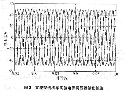 該仿真模型主要包含三相交流電源模塊,整流模塊,變壓器模塊,斬波模塊,自適應(yīng)模糊PID控制模塊,自定義函數(shù)Fcn模塊,濾波模塊,直流電機(jī)負(fù)載,以及仿真結(jié)果示波器Scope顯示模塊等。圖2仿真結(jié)果直觀地呈現(xiàn)了直流架線機(jī)車實(shí)驗(yàn)電源調(diào)壓器輸出波形。