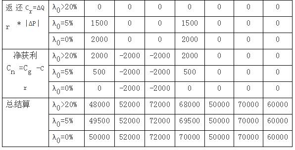解決信息不對稱造成的不公平的另外一種方法,是要求將由于偏差電量造成的盈利返還,也就是目前廣東電力市場采用的方法。表2的最后一行給出了返還后的結(jié)果??梢钥吹剑钍找娣颠€機(jī)制下,同一價(jià)格情景下不同偏差情景下的電費(fèi)差別變小,但并沒有完全消除。以情景A為例,當(dāng)沒有偏差電量收益返還機(jī)制時(shí),情景1和情景2的電費(fèi)差別是4000元(=52000-48000);當(dāng)有偏差電量收益返還機(jī)制時(shí),情景1和情景2的電費(fèi)差別小于等于4000元,λ0為20%、5%、0%時(shí),差別分別是4000元、2500元和2000元。