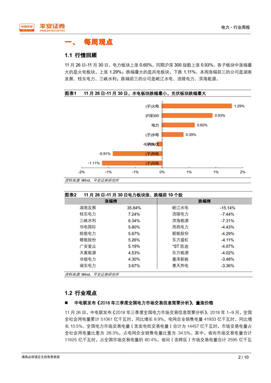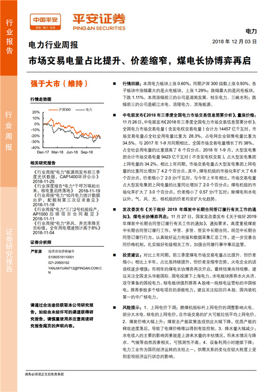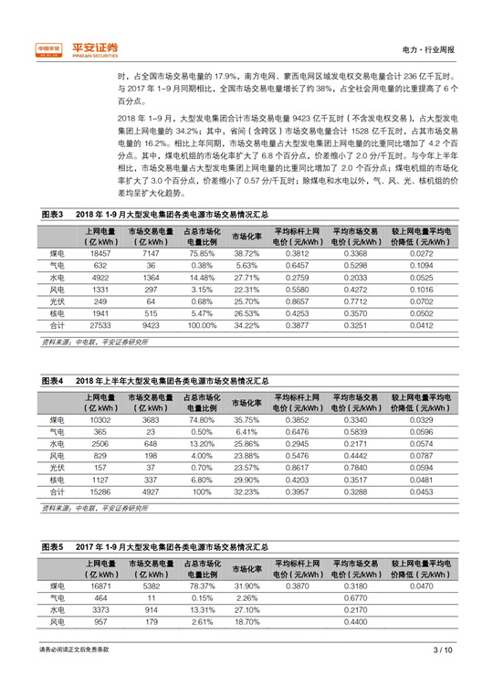 中電聯(lián)發(fā)布《2018年三季度全國電力市場交易信息簡要分析》,量漲價縮:11月26日,中電聯(lián)發(fā)布《2018年三季度全國電力市場交易信息簡要分析》。全國電力市場交易電量(含發(fā)電權(quán)交易電量)合計為14457億千瓦時,市場交易電量占全社會用電量比重為28.3%,占電網(wǎng)企業(yè)銷售電量比重為34.5%。與2017年1-9月同期相比,全國市場交易電量增長了約38%,占全社會用電量的比重提高了6個百分點。2018年1-9月,大型發(fā)電集團(tuán)合計市場交易電量9423億千瓦時(不含發(fā)電權(quán)交易),占大型發(fā)電集團(tuán)上網(wǎng)電量的34.2%。相比上年同期,市場交易電量占大型發(fā)電集團(tuán)上網(wǎng)電量的比重同比增加了4.2個百分點。其中,煤電機(jī)組的市場化率擴(kuò)大了6.8個百分點,價差縮小了2.0分/千瓦時。與今年上半年相比,市場交易電量占大型發(fā)電集團(tuán)上網(wǎng)電量的比重同比增加了2.0個百分點;煤電機(jī)組的市場化率擴(kuò)大了3.0個百分點,價差縮小了0.57分/千瓦時;除煤電和水電以外,氣、風(fēng)、光、核機(jī)組的價差均呈擴(kuò)大化趨勢。