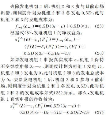 根據(jù)價值公平分配機(jī)制,一臺發(fā)電機(jī)組獲得收益為該發(fā)電機(jī)組參與日前市場前后,其他機(jī)組總發(fā)電成本的變化。下面重點(diǎn)分析在價值公平分配機(jī)制下,發(fā)電機(jī)組申報真實(shí)成本為其占優(yōu)策略。