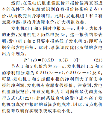 當(dāng)所有發(fā)電機(jī)組申報真實(shí)成本時,日前市場出清模型自動滿足系統(tǒng)成本最小化的性質(zhì);值得注意的是,發(fā)電機(jī)組虛假報價,可能導(dǎo)致發(fā)電出力計(jì)劃難以實(shí)現(xiàn)真實(shí)發(fā)電成本的最小化。