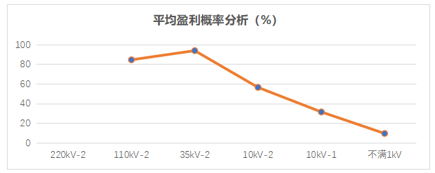 分析的結(jié)果:在全國32個(gè)省級(jí)輸配電網(wǎng)的輸配電價(jià)中,我們計(jì)算了各電壓等級(jí)的輸配電價(jià)差價(jià),按照高于、低于線損分?jǐn)倖蝺r(jià)進(jìn)行了統(tǒng)計(jì)分析。在不考慮其它成本的情況下,高于線損分?jǐn)倖蝺r(jià)的收益為正數(shù)(盈利),低于線損分?jǐn)倖蝺r(jià)的收益為負(fù)數(shù)(虧損)。低壓(不滿1kV)輸配電價(jià)差價(jià)高于線損分?jǐn)倖蝺r(jià)的有3個(gè),盈利占比為9.4%;29個(gè)低于線損分?jǐn)倖蝺r(jià),虧損占比為90.6%;該電壓等級(jí)虧損可能性極高。10kV-1的輸配電價(jià)差價(jià)高于線損分?jǐn)倖蝺r(jià)的10個(gè),盈利占比為31.3%;22個(gè)低于線損分?jǐn)倖蝺r(jià),虧損占比為68.7%;該電壓等級(jí)虧損可能性很高。10kV-2的輸配電價(jià)差價(jià)高于線損分?jǐn)倖蝺r(jià)的18個(gè),盈利占比為56.3%;14個(gè)低于線損分?jǐn)倖蝺r(jià),虧損占比為43.7%;該電壓等級(jí)虧損可能性中等高。35kV-2的輸配電價(jià)差價(jià)高于線損分?jǐn)倖蝺r(jià)的30個(gè),盈利占比為93.7%;2個(gè)低于線損分?jǐn)倖蝺r(jià),虧損占比為6.3%;該電壓等級(jí)盈利可能性極高。110kV-2的輸配電價(jià)差價(jià)高于線損分?jǐn)倖蝺r(jià)的27個(gè),盈利占比為84.4%;5個(gè)低于線損分?jǐn)倖蝺r(jià),虧損占比為15.6%;該電壓等級(jí)盈利可能性很高。全國輸配電價(jià)各電壓等級(jí)的平均盈利概率如圖二: