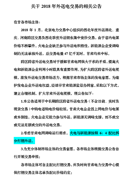 新能源資源豐富是甘肅省的獨特優(yōu)勢,按照電網(wǎng)調峰的需求,新能源的電量外送須有火電的參與方能執(zhí)行。在2018年的外送電交易中,考慮到甘肅電網(wǎng)調峰運行需求,火電與新能源按照6:4配比拆分打捆外送,這意味著無論從企業(yè)還是地方來說,要想擴大送電規(guī)模,必須達到6:4的打捆配比要求。