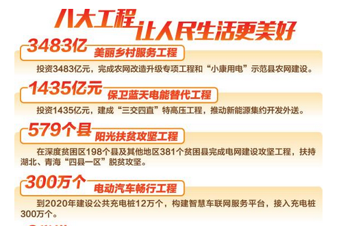 ──保衛(wèi)藍天電能替代工程。主要安排清潔能源消納和電能替代2項舉措,投資1435億元,建成“三交四直”特高壓工程,推動西南水電和西部、北部新能源集約開發(fā)外送,每年在發(fā)電側消納清潔能源2.2萬億千瓦時;2018~2020年在消費側以電代煤、代油5800億千瓦時,減排二氧化碳等污染物7.6億噸。