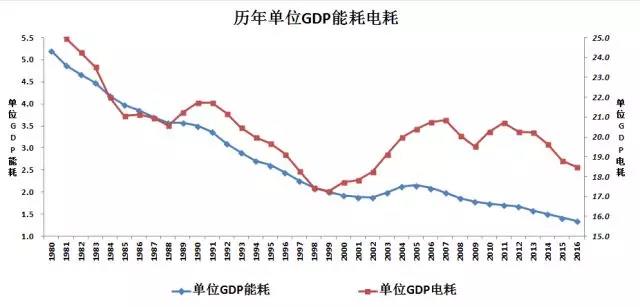 能源消費(fèi)總量增速趨緩是能源轉(zhuǎn)型的契機(jī)。我國(guó)經(jīng)濟(jì)發(fā)展階段正在向后工業(yè)化階段轉(zhuǎn)型,技術(shù)創(chuàng)新與進(jìn)步使各個(gè)行業(yè)的能源利用效率水平大幅度提高,具有資金密集型和能源高強(qiáng)度投入屬性的基礎(chǔ)材料業(yè)生產(chǎn)比重有所降低,全社會(huì)經(jīng)濟(jì)發(fā)展的質(zhì)量和能效在加快提高,經(jīng)濟(jì)發(fā)展對(duì)能源投入需求的依賴在減弱。改革開放以來四十年來,燃煤電廠的能源轉(zhuǎn)換和電力輸送效率均提高了30%以上;全球金融危機(jī)后2010年以來的7年間,鋼鐵冶煉能效年均提高一個(gè)百分點(diǎn),水泥提高大致1.5個(gè)百分點(diǎn),公路運(yùn)輸以及新建建筑能效更是以年均1.8個(gè)百分點(diǎn)的幅度大踏步提高。全國(guó)歷年平均單位GDP能耗、電耗變化趨勢(shì)見圖1。