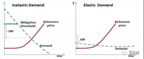 不過(guò),在加州方法下面,當(dāng)一家發(fā)電方的容量不足以成為關(guān)鍵供應(yīng)商但面臨著無(wú)彈性的剩余需求曲線時(shí),會(huì)出現(xiàn)更高的加成。在這種情況下面,CAISO的減緩方法不會(huì)起作用,供電方會(huì)報(bào)出天花板價(jià)格。總的來(lái)說(shuō),減緩機(jī)制的運(yùn)作和剩余需求曲線的形狀緊密相關(guān)。市場(chǎng)中供應(yīng)商所面臨的剩余需求曲線的形狀主要由市場(chǎng)的總供給曲線決定。例如,一個(gè)有充足的基礎(chǔ)負(fù)荷能力的市場(chǎng)的供應(yīng)商不太可能面對(duì)陡峭的剩余需求曲線。而市場(chǎng)中容量的增減則會(huì)很大程度影響市場(chǎng)力減緩機(jī)制的運(yùn)行。