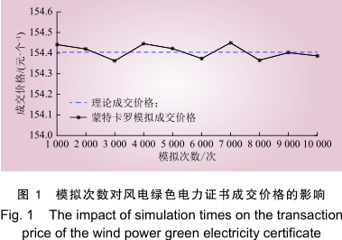在不同模擬次數(shù)下風(fēng)電綠色電力證書的蒙特卡羅模擬成交價(jià)格圍繞理論成交價(jià)格上下波動,且非常接近理論成交價(jià)格,可見成交價(jià)格具有較好的穩(wěn)定性。