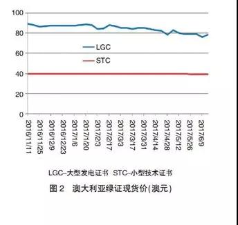 各國綠證交易價格主要受證書供需形勢影響,同時也與可再生能源發(fā)電技術(shù)類型、季節(jié)波動、監(jiān)管懲罰強(qiáng)度等多種因素相關(guān),具有較大的差異性和波動性。從美國新英格蘭地區(qū)各州的綠證現(xiàn)貨價格來看,馬薩諸塞、羅得島、康乃狄克和新罕布什爾州的綠證供應(yīng)在2013~2015年期間供應(yīng)偏緊,單位綠證的交易價格達(dá)50~60美元,而同期的緬因州由于生物質(zhì)發(fā)電計入綠證核發(fā)范圍、綠證供應(yīng)顯著高于需求,價格降至10美元以下。澳大利亞大型發(fā)電技術(shù)證書價格因供應(yīng)增加,自2016年下半年以來震蕩下行,但截至2017年6月仍高于75澳元;小型技術(shù)證書則主要受限價、罰款等因素影響,一直保持在最高限定價格40澳元附近。此外,從部分國家和地區(qū)的交易市場來看,風(fēng)電由于成本和價格較低在早期時是綠證交易主體,太陽能發(fā)電由于價格快速下降、有取代風(fēng)電成為交易主體的趨勢(見圖1、圖2)。