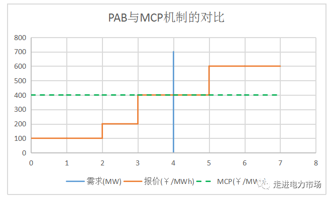 關(guān)鍵是PAB下的結(jié)果。PAB下,市場主體從自身利益最大化的角度,會如何報價呢?其最佳策略會仍然是按照真實(shí)的成本報價嗎?顯然不是。其策略是:預(yù)測系統(tǒng)中最后入圍(報價最高)的機(jī)組的報價,然后報一個類似的價格。比如,本例子中,市場主體如果能夠準(zhǔn)確預(yù)測市場的需求情況,也知道市場中各個發(fā)電機(jī)組的容量和成本情況,考慮到一般市場主體的報價不會低于實(shí)際成本,無論發(fā)電企業(yè)自身的發(fā)電成本是多少,其最佳策略都是報一個略低于400¥/MWh的價格。
