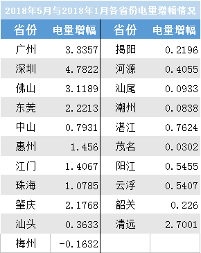 2018年5月與2018年1月月度結(jié)算電量增幅情況(單位:億千瓦時)