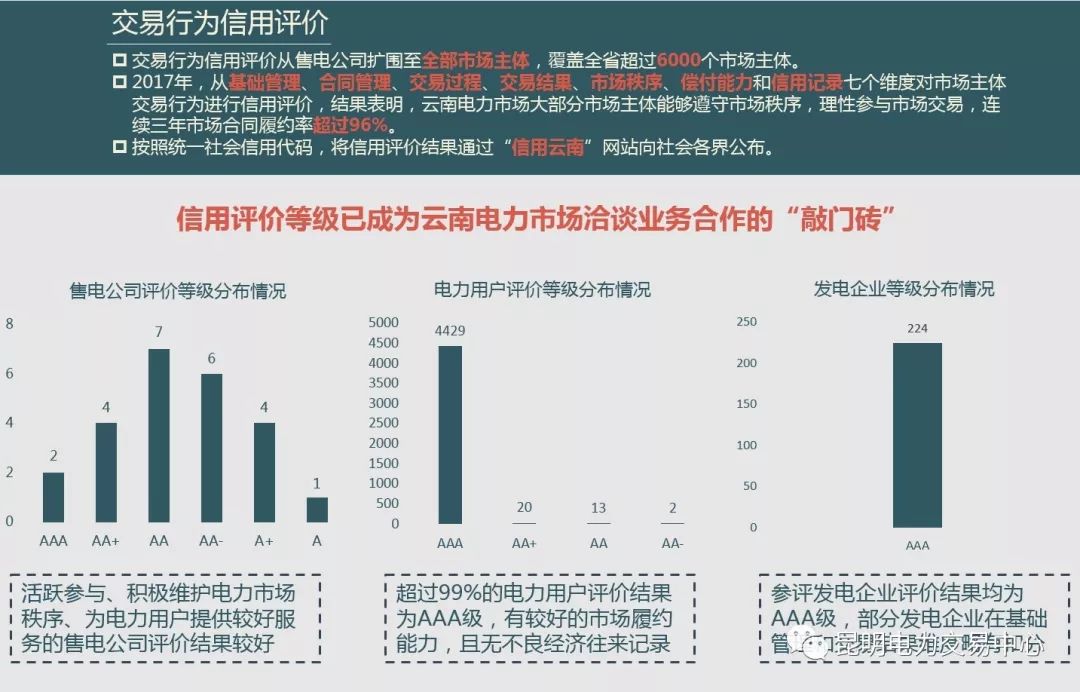 開展市場主體交易行為評(píng)價(jià),才能有效控制市場風(fēng)險(xiǎn)。昆明電力交易中心建立了市場主體管理標(biāo)準(zhǔn),規(guī)范了入市與退市的流程和方式,界定了市場主體的權(quán)利、責(zé)任和義務(wù),為市場主體提供了行為準(zhǔn)則和規(guī)范。與中國人民銀行征信系統(tǒng)聯(lián)網(wǎng),企業(yè)信用與合約履行掛鉤。率先啟動(dòng)售電公司交易行為評(píng)價(jià)體系建設(shè),建立黑名單和負(fù)面準(zhǔn)入制度,懲戒售電公司違規(guī)參與市場行為,引導(dǎo)售電公司有序發(fā)展。售電公司交易信用評(píng)價(jià)等信息通過“信用云南”定期發(fā)布。在此基礎(chǔ)上,將交易行為信用評(píng)價(jià)擴(kuò)展到全部注冊發(fā)電企業(yè)、電力用戶,促進(jìn)云南電力市場形成良好信用環(huán)境,信用等級(jí)已經(jīng)逐漸成為市場主體開展電力交易業(yè)務(wù)合作的“敲門磚”。建立風(fēng)險(xiǎn)預(yù)警制度,識(shí)別電力交易中的業(yè)務(wù)風(fēng)險(xiǎn)并公開發(fā)布預(yù)警提示,幫助市場主體有效規(guī)避風(fēng)險(xiǎn)。