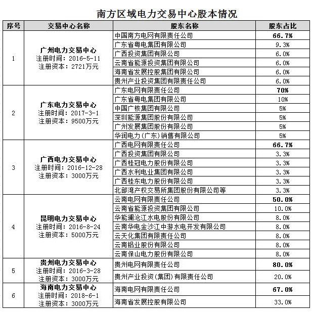 我們從文件中了解到,諸多電力交易中心作為重要的電力交易管理機(jī)構(gòu),它承擔(dān)了國家電網(wǎng)南方電網(wǎng)與各市場主體之間的橋梁作用。而在之前的北京電力交易中心是國家電網(wǎng)全資建立,廣州電力交易中心是南方電網(wǎng)控股,各?。▍^(qū)、市)電力交易中心也鮮有民間資本注入,電力市場化交易的管理權(quán)限仍然完全把握在兩大電網(wǎng)公司中。南方區(qū)域電力交易中心處于改革最前沿,在建立之初,多以股份制方式建立。大云網(wǎng)以此為例,匯總統(tǒng)計了廣州及南方五省電力交易中心股權(quán)結(jié)構(gòu)。