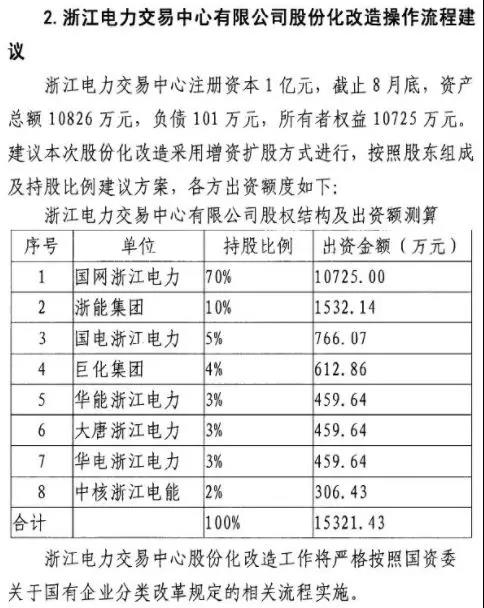 下面來看看浙江,浙江省發(fā)改委日前發(fā)布了關(guān)于《浙江省電力交易中心有限公司股份化改造的建議方案》的函,其中,建議國網(wǎng)浙江電力持股比例為70%,其余30%股份由7家公司出資,中核浙江電能作為售電公司代表占股2%。