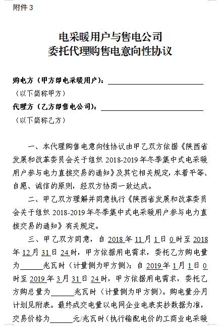 為貫徹落實(shí)黨中央、國務(wù)院關(guān)于推進(jìn)北方地區(qū)清潔供暖和陜西省人民政府《鐵腕治霾打贏藍(lán)天保衛(wèi)戰(zhàn)三年行動(dòng)方案(2018-2020年)(修訂版)》的決策部署,加快推進(jìn)全省清潔供暖工作,鼓勵(lì)和支持廣大用戶采用清潔能源取暖,努力減少散燒煤取暖帶來的環(huán)境污染,促進(jìn)全省空氣質(zhì)量持續(xù)向好,現(xiàn)開展2018-2019年冬季集中式電采暖用戶參與電力直接交易組織工作,現(xiàn)將有關(guān)事項(xiàng)通知如下: