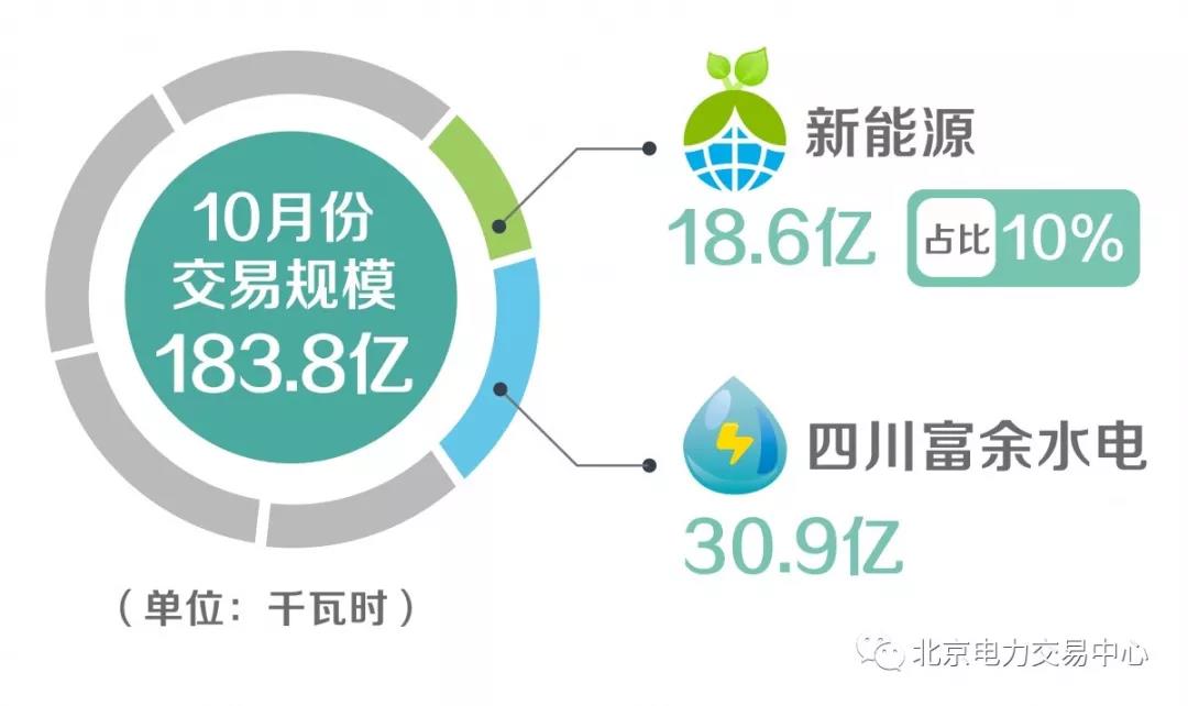 2018年10月,北京電力交易中心組織開展市場化交易48筆,交易規(guī)模183.8億千瓦時,其中,新能源18.6億千瓦時、占比10%,四川富余水電30.9億千瓦時。