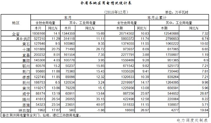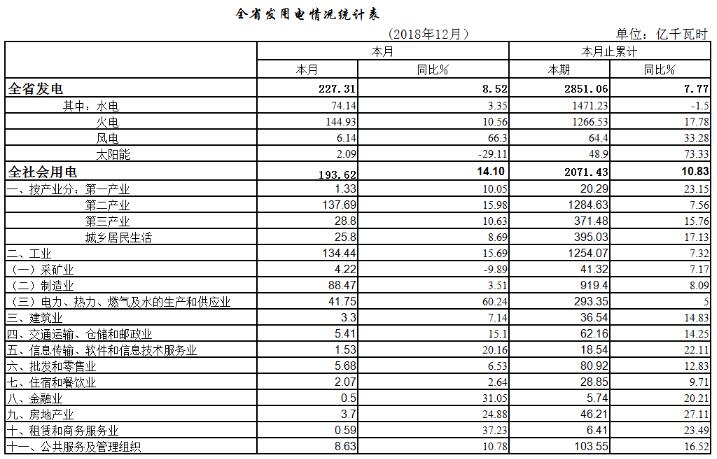 截止年底,全省全口徑裝機(jī)容量7401 05萬千瓦,同比增長3 88%;全年發(fā)電量2851 06億千瓦時(shí),增長7 77%;全社會(huì)用電量2071 43億千瓦時(shí),增長10 83%,其中工業(yè)用電量1254 07億千瓦時(shí),增長7 32%。