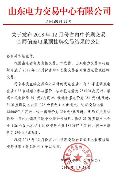 山東2018年12月省內(nèi)中長期交易合同偏差電量預(yù)掛牌交易:交易電量186萬兆瓦時
