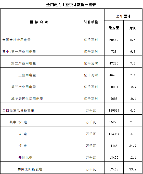 國家能源局:2018年全社會用電量68449億度 同比增長8.5%