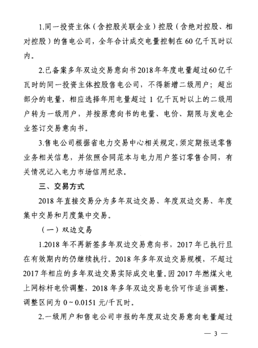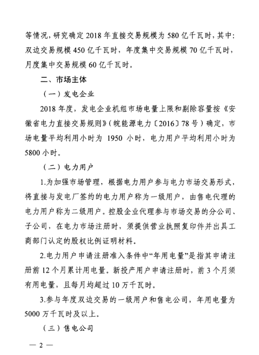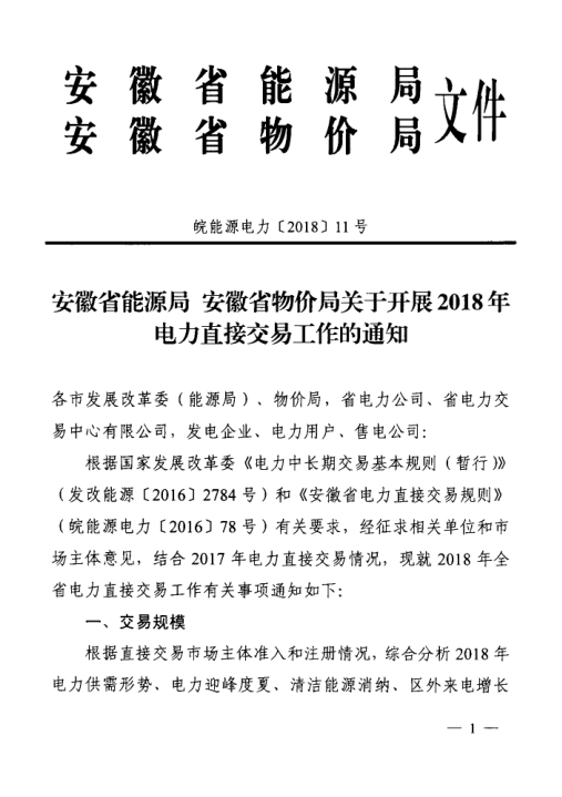 安徽省能源局、安徽省物價局日前下發(fā)了《關于開展2018年電力直接交易工作的通知》,通知中稱,2018年直接交易規(guī)模為580億千瓦時,其中雙邊...