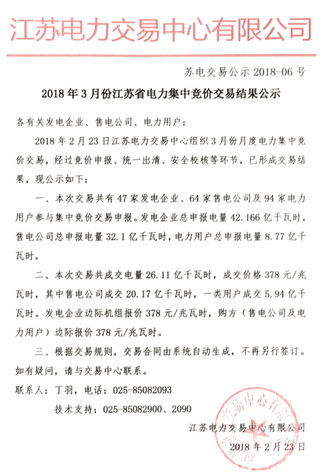 江蘇電力交易中心日前發(fā)布了2018年3月份江蘇省電力集中競價(jià)交易結(jié)果公示,本次交易共有47家發(fā)電企業(yè)、64家售電公司及94家電力用戶參與集中...