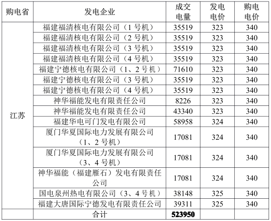 3月江蘇購福建交易結果:成交電量5.2395 億千瓦時 2家核電6家火電企業(yè)中標
