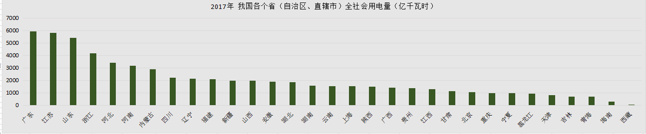 從全社會(huì)用電量總量上看,2017年,我國各個(gè)省(自治區(qū)、直轄市)全社會(huì)用電量東高西低的情況依然加劇。