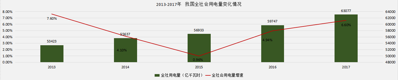 根據(jù)國家能源局公布2017年我國電力工業(yè)運(yùn)行數(shù)據(jù)顯示,2017年,我國全社會(huì)用電量63077億千瓦時(shí),同比增長6.6%。