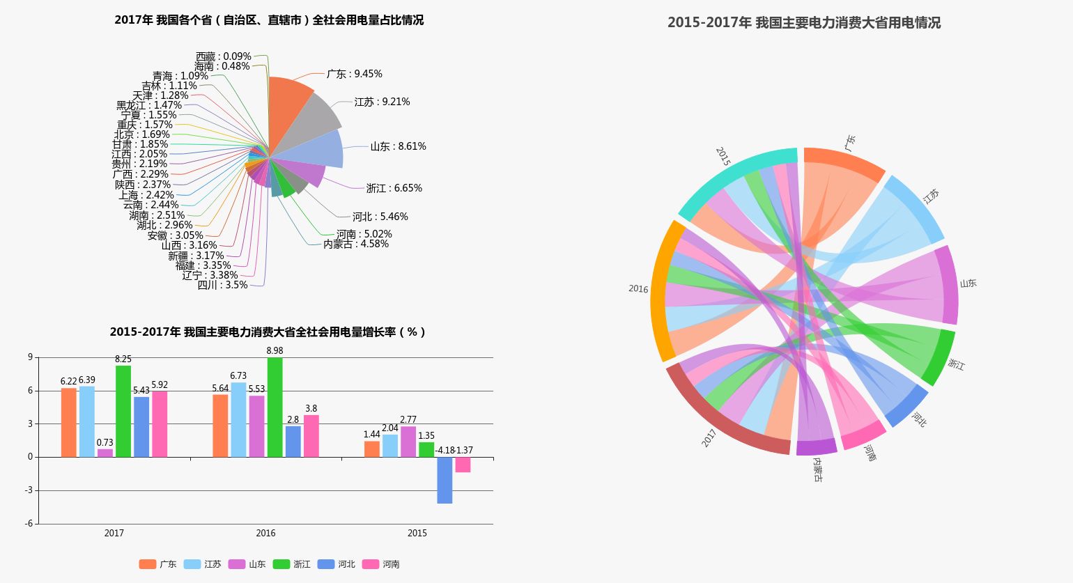 2017年,東部、南方地區(qū)依然是我國主要的經(jīng)濟(jì)區(qū),廣東、江蘇、山東、浙江GDP超過50000億元4個(gè)經(jīng)濟(jì)大省,同時(shí)全社會(huì)用電量也居于全國前四位,四個(gè)省份綜合占我國全社會(huì)用電量的33.9%,與去年同期相比下降了0.1個(gè)百分點(diǎn)。