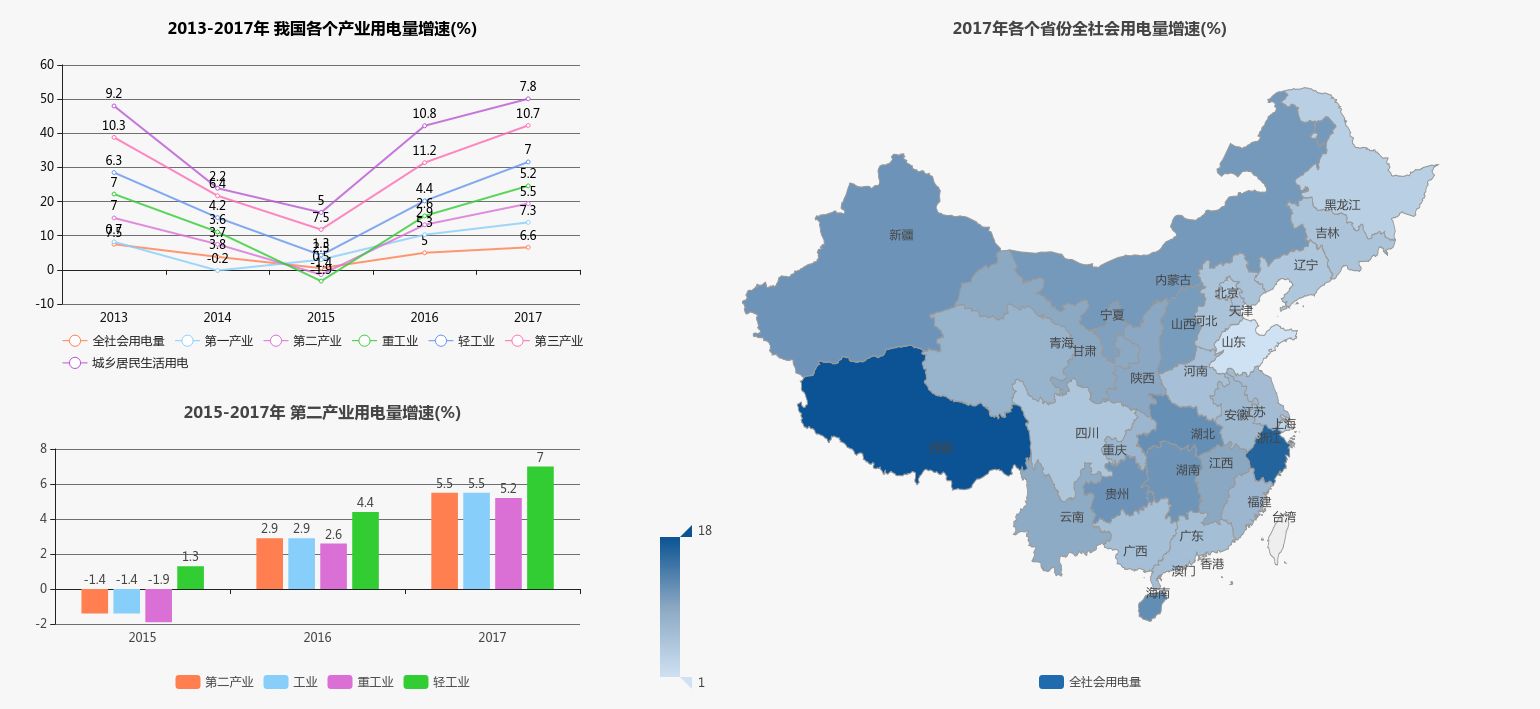 從全社會(huì)用電量增速上看,2017年,我國各個(gè)省(自治區(qū)、直轄市)全社會(huì)用電量已經(jīng)出現(xiàn)全面增長的局面。