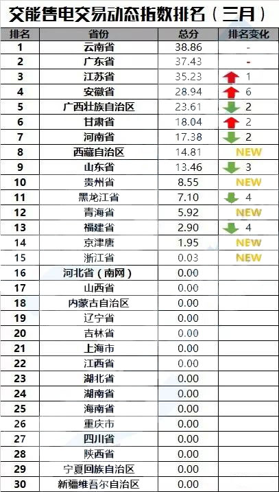 通過與1月的結(jié)果對比,我們得出了最新的全國電力交易動態(tài)指數(shù)得分和排名: