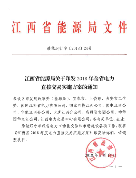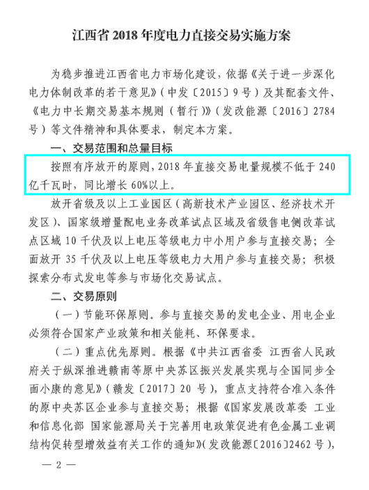 江西省能源局日前發(fā)布了《江西省2018年度電力直接交易實(shí)施方案》,方案中稱,2018年江西直接交易電量規(guī)模不低于240億千瓦時(shí),同比增長60%以